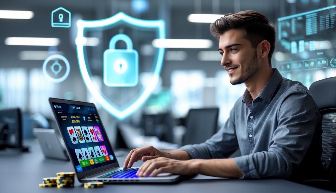 Seorang pria duduk di depan laptop dengan tampilan permainan poker online dan simbol keamanan di latar belakang.