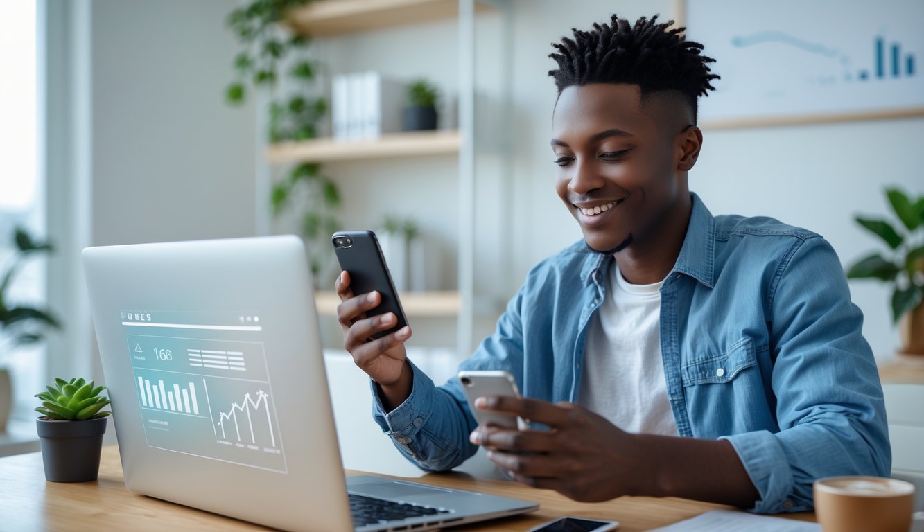 Seorang dewasa muda menggunakan laptop dan ponsel di ruang kerja rumah yang rapi, tersenyum sambil memeriksa data keuangan.