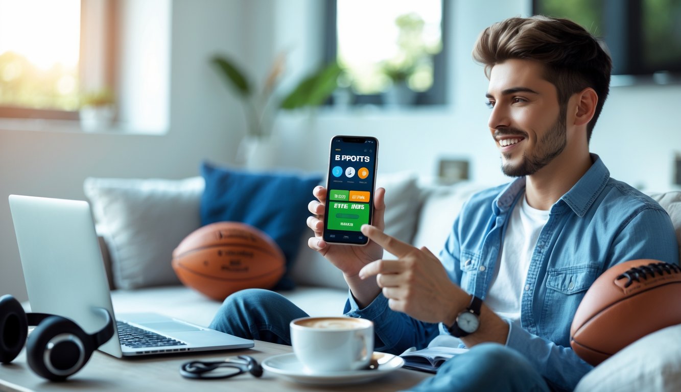 Seorang pria muda menggunakan ponsel untuk taruhan olahraga di ruang tamu yang nyaman dengan bola sepak dan bola basket di sekitar.